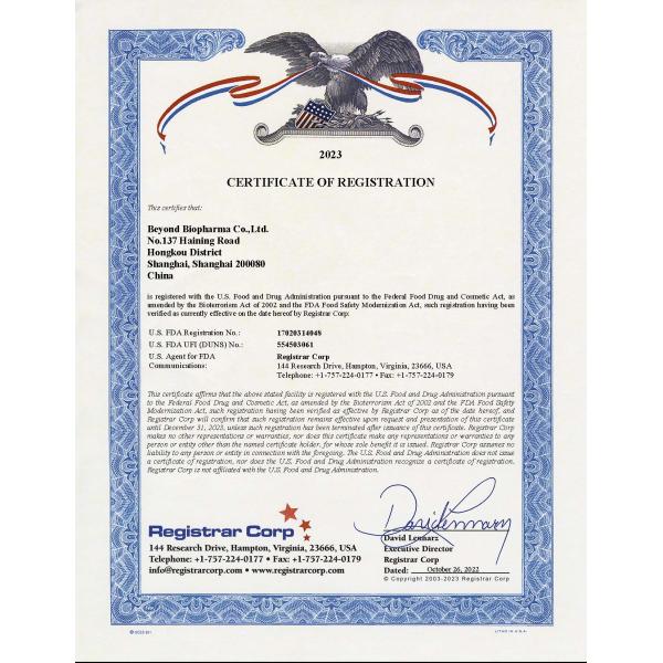 We Beyond Biopharma put quality as priority in the management of our company. We had passed the ISO9001 and ISO22000 Quality management system for our Collagen series products. We also established our quality management system according to Food GMP requirements.